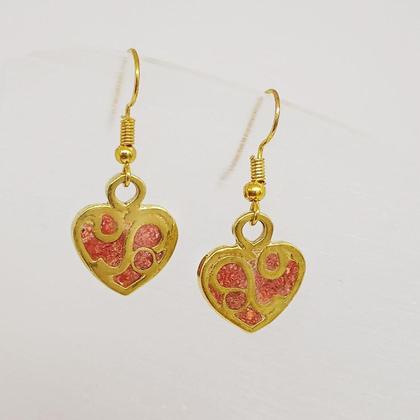 Hierbei wurde ein von Ornamenten durchbrochenes Herz aus Goldbronze gefertigt und die Zwischenräume mit kleinsten Korallenstückchen gefüllt. Danach wird das Herz mit einem glasklaren 2Komponentenharz vergossen, geschliffen und poliert. Somit ist die rote Korallenfüllung von beiden Seiten sichtbar und bruchsicher eingefasst.