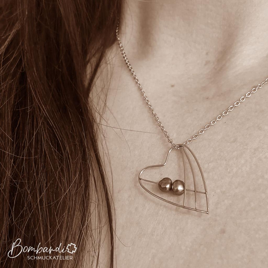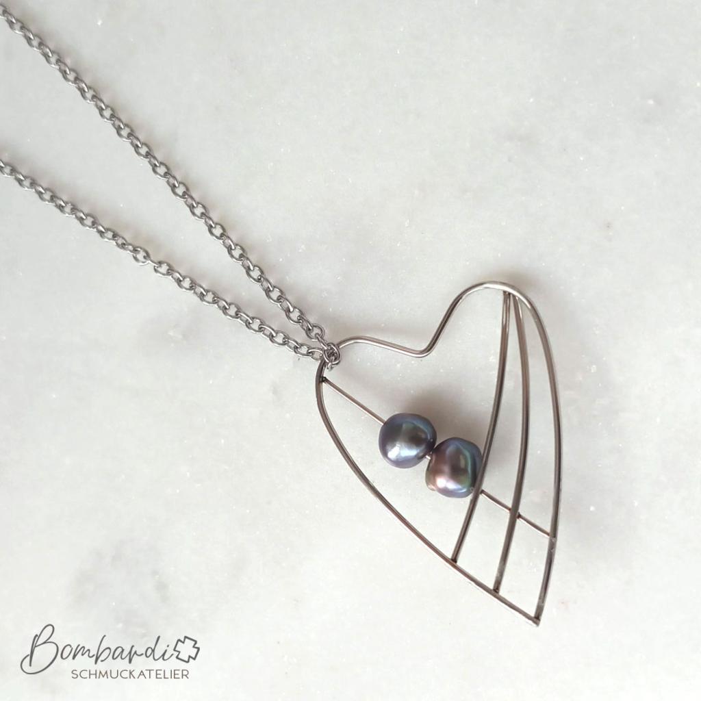 Diese Kette mit einem handgefertigten, filigran gestalteten Herzen, veredelt mit zwei unterschiedlichen Perlen in zarten Grau/Violett/Grüntönen symbolisieren nicht nur Zuneigung sondern stehen für ein klassisch elegant interpretiertes Herz.