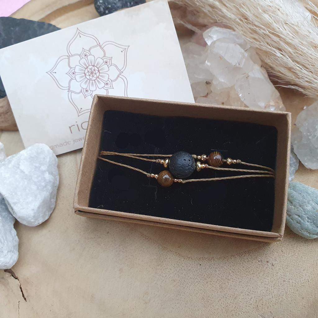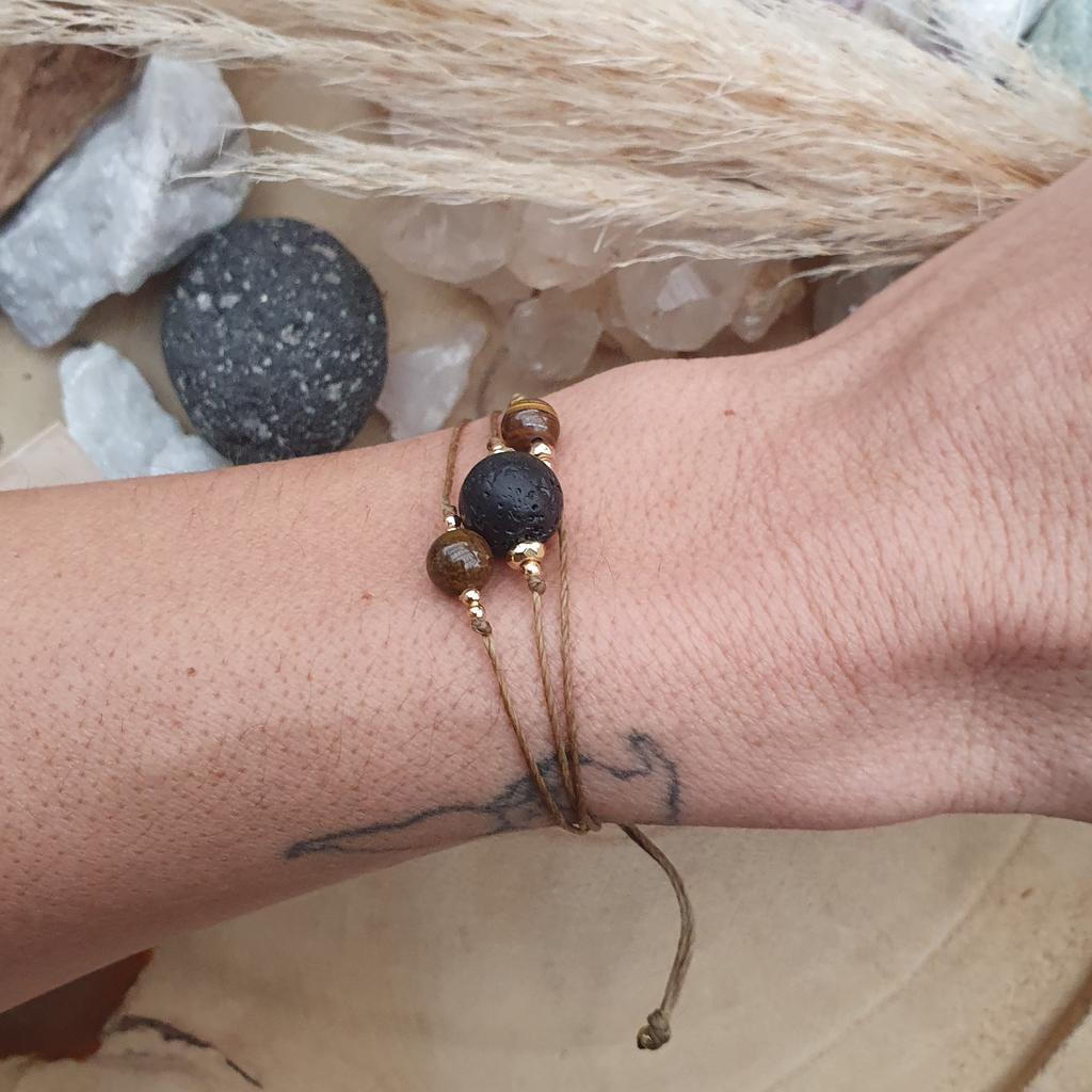 Kraftvolles Edelsteinarmband mit natürlichem Lavastein (10mm), 6mm Tigeraugeperlen & 18k vergoldeten Kupferperlen.