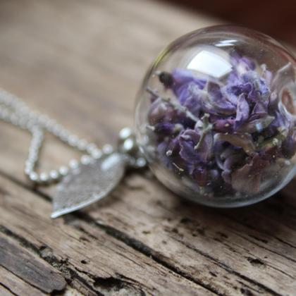 Glashohlkugel gefüllt mit selbst getrockneten lila Ginsterblüten