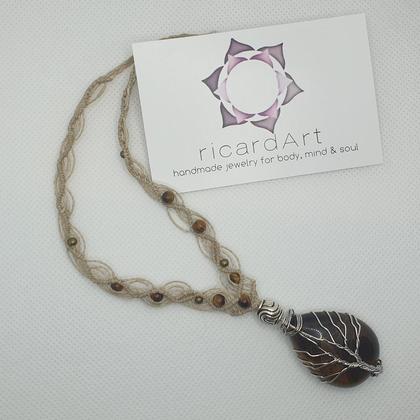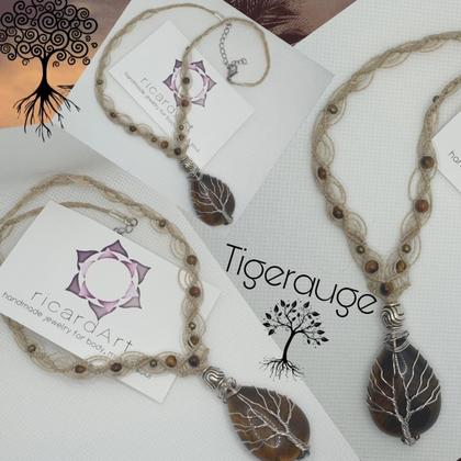 Von Hand gefertigte Makrameekette mit einem wunderschönen, in Draht eingefasstem Tigerauge ♡ Verschluss: Edelstahlkarabiner mit Verlängerungskettchen