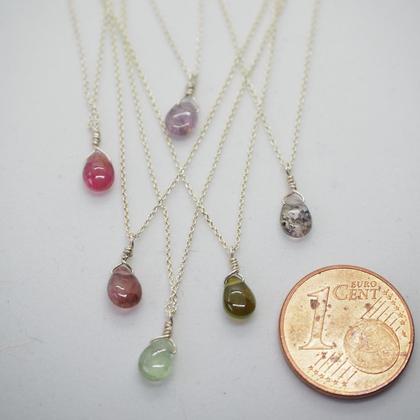 Ein kleiner, bunter Turmalintropfen, der auf einer sehr feinen Sterlingsilberkette hängt. Ein zarter Farbtupfer, der jedem sofort ins Auge sticht, ohne zu protzen.