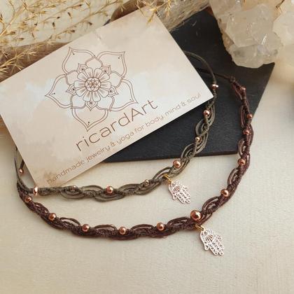 Von Hand gefertigte Makramee Fußbänder aus gewachstem Makrameegarn (strapazierfähig & wasserfest), mit nickelfreien, rosévergoldeten Messinganhängern (12*7mm) & längenverstellbarem Schiebeverschluss zum individuellen Anpassen.