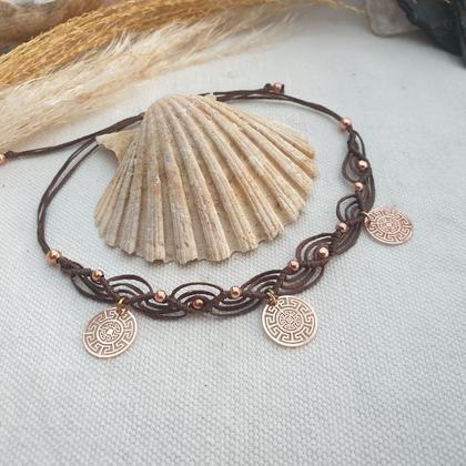 Handgefertigtes Makramee Fußband aus gewachstem Makrameegarn (strapazierfähig & wasserfest), mit rosévergoldeten Messinganhängern (12mm/nickel/cadmiumfrei) & längenverstellbarem Schiebeverschluss zum individuellen Anpassen