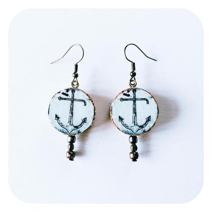 Bronzefarbene Ohhringe mit Korkanhänger und Ankerfotografie