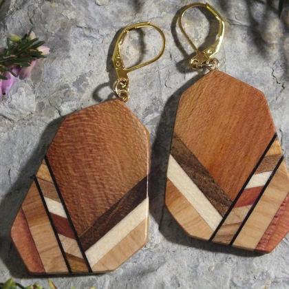 Die Ohrringe sind aus 6 Holzarten, Nussbaum (Juglans regia), Zwetschke (Prunus domestica), Ahorn (Acer pseudoplatanus), Magnolie (Magnolia soulangeana), Wildkirsche (Prunus avium) und Goldregen (Laburnum spp.).