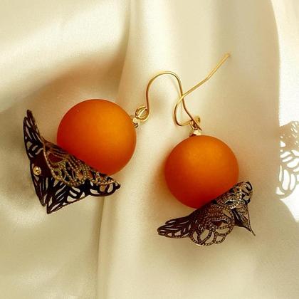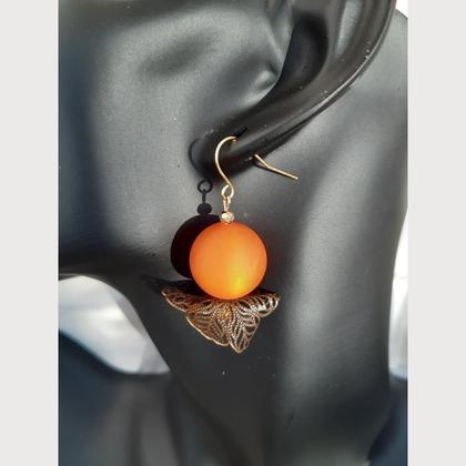 Mit diesen handangefertigten Ohrringen mit einer attraktiven leuchtenden Polarisperle in Rostorange mattiert, getragen von einem filigranen, blütenförmigen Schmuckelement aus Messing in Rostbraun und gekrönt mit einer runden brozenfarbigen, facettierten Glasperle ist dir deine uneingeschränkte Aufmerksamkeit garantiert. Die schlichten Ohrhaken aus Edelstahl der Klasse 304 mit einer hochwertigen, langlebigen, goldenen Vakuum Galvanisierung geben dem Accessoire einen edlen Abschluss.