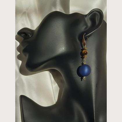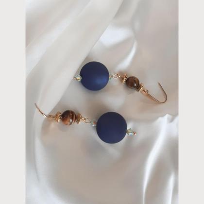 Ein schlichter, tropfenförmiger Ohrhaken aus Edelstahl der Klasse 304 mit einer hochwertigen, goldfarbigen Vakuum Galvanisierung wurde mit einer edlen Kreation aus einer Polarisperle in Montana matt, einem Tigerauge und wunderschön geschliffenen, original Swarovski Biconen angefertigt.