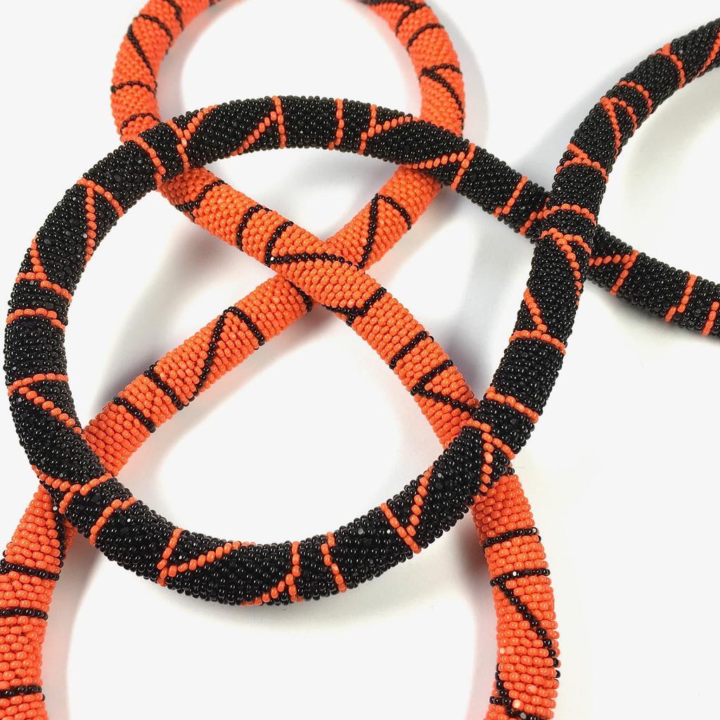 Die Halskette in schwarzer Grundfarbe misst etwa 50cm, die mit orange als Grundfarbe misst 49cm.