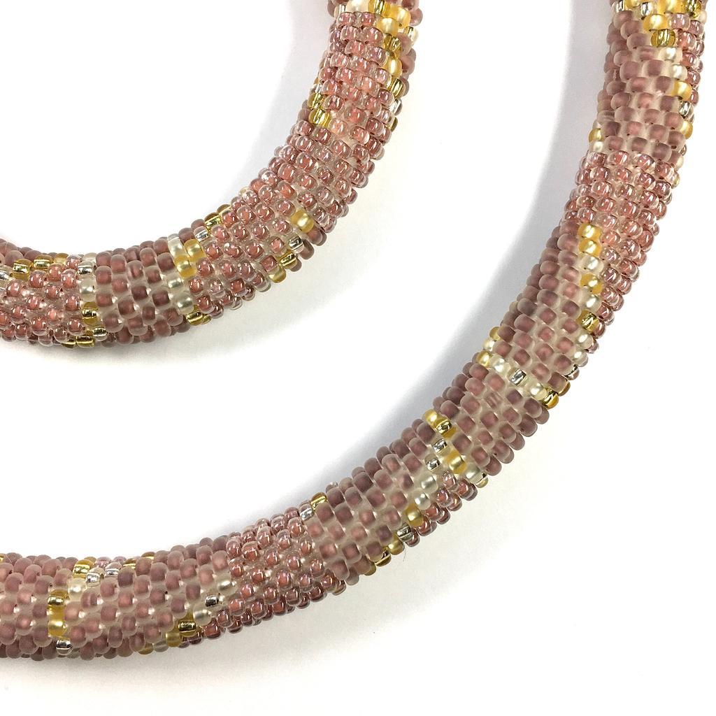 In dieser traditionellen Technik des Häkelns von Glasperlen werden für diese Halskette 2500 rosefarbene, silberfarbene, und goldfarbene Glasperlen nach einem von mir entworfenen geometrischen Muster auf Baumwollgarn gefädelt.