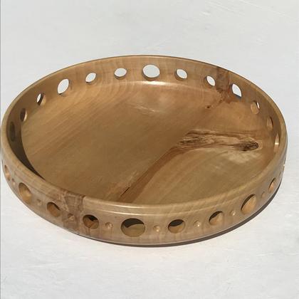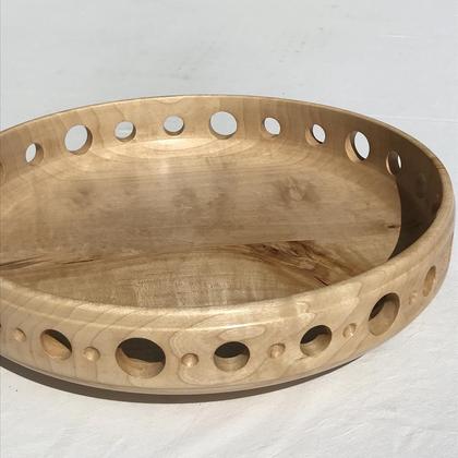 Sehr große Schale aus Birkenholz, mit luftigem Design, schönes Format auch um Produkte zu präsentieren.