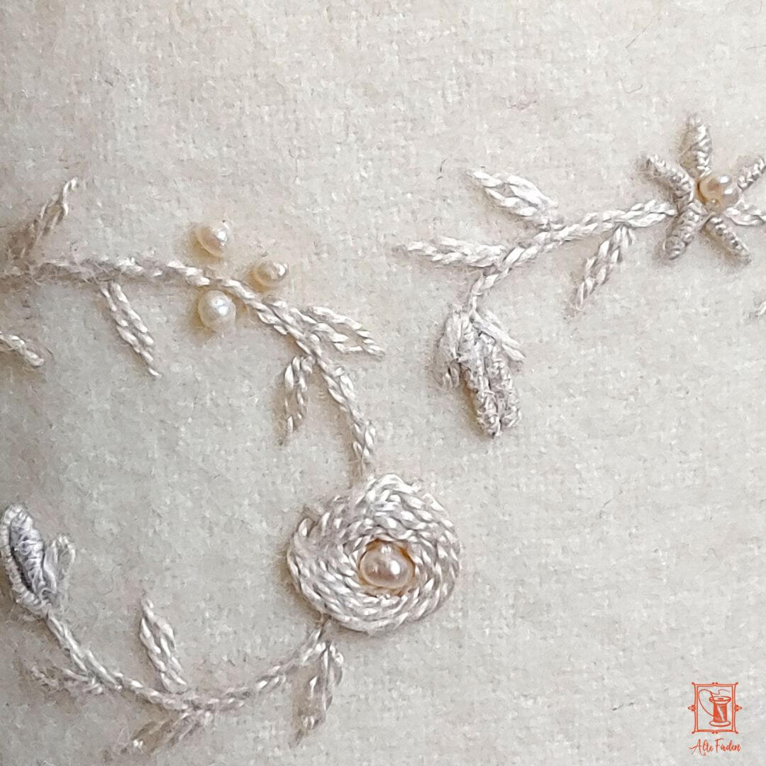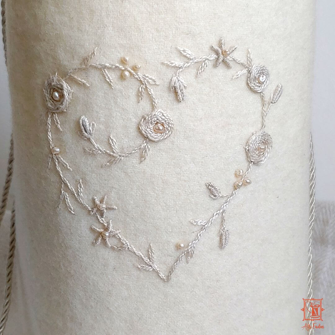 • handbestickt mit einem Herz aus Seidenfäden und echten Süßwasserperlen