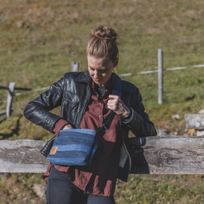 Die einzelnen Jeansstreifen und die wiederverwerteten Sicherheitsgurte machen das Produkt zu einem Unikat und einer Besonderheit.