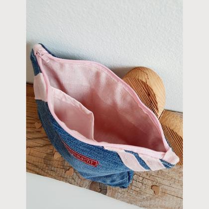 Sie ist aussen aus blauem Jeansstoff, der mal eine Hose war und mit rosa Baumwollstoff verziert.