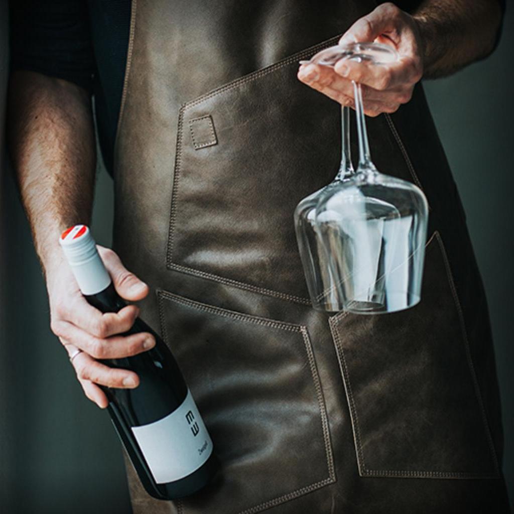 Naturbelassene, hitzeresistente und wasserabweisende Lederschürze in natürlichem Braun.