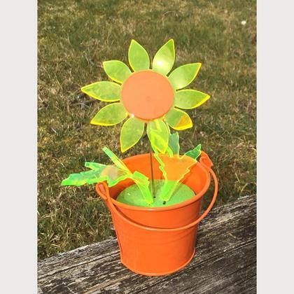 Blumen aus fluoreszierendem Plexiglas in bunten Eimern. Jedes Stück handgemacht.