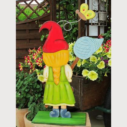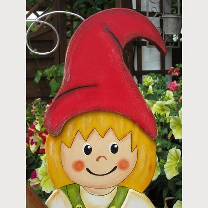 Die Gartenwichtel sind liebevoll aus Pappelholz gefertigt und freuen sich über jedes schöne blumige Plätzchen im geschützten Außenbereich.