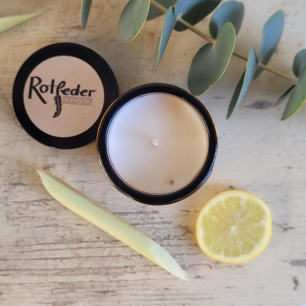 Duftkerze "Tiaf Luft huin" im 60ml Braunglas mit Deckel. Die Kerze besteht aus pflanzlichem Raps-und Kokoswachs, einem Baumwolldocht, sowie ätherischen Ölen. Eukalyptus stammt ursprünglich aus Australien, und galt dort schon als eine der wichtigsten Heilpflanzen der dortigen Ureinwohner. Das ätherische Öl wirkt gut bei Erkältung, Atembeschwerden, und sein frischer Duft erleichtert das tiefe Durchatmen. Beide Öle reinigen und klären die Raumluft, speziell Citronella kann diverse starke Gerüche gut beseitigen. Weiters wirkt die Kerze in der warmen Jahreszeit auch super gegen Gelsen und Co. Ein wirklich angenehmer, frischer Duft, der uns wieder tief Luft holen lässt!