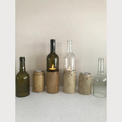 Windlicht / Teelicht aus trockenem, ausgewählten Robinenholz gedrechselt, Flasche recycelt, handgeschnitten in --WEISS oder GRÜN--, Holz einzeln auf Flasche angepaßt, 4 Luftlöcher sorgen für gute Luftzufuhr, Holz bei grünen Woodlights geölt – wirken rustikaler, Holz bei weissen Flaschen unbehandelt – wirken eleganter //(bitte bei Bestellung Farbwunsch bekannt geben)//