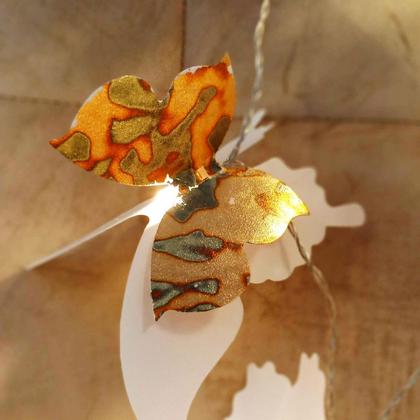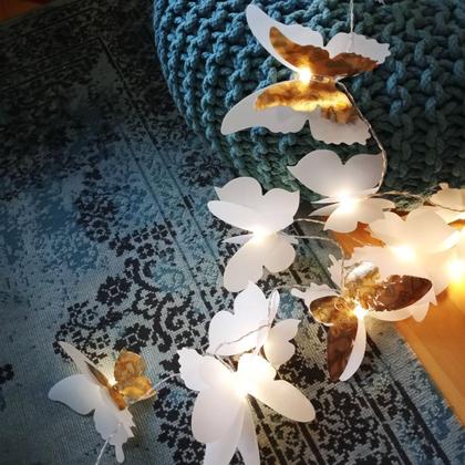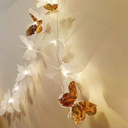 Phantasievolle handgefertigte Lichterkette mit opalweißen und barockgolden schimmernden Schmetterlingen für eine stimmungsvolle Beleuchtung.