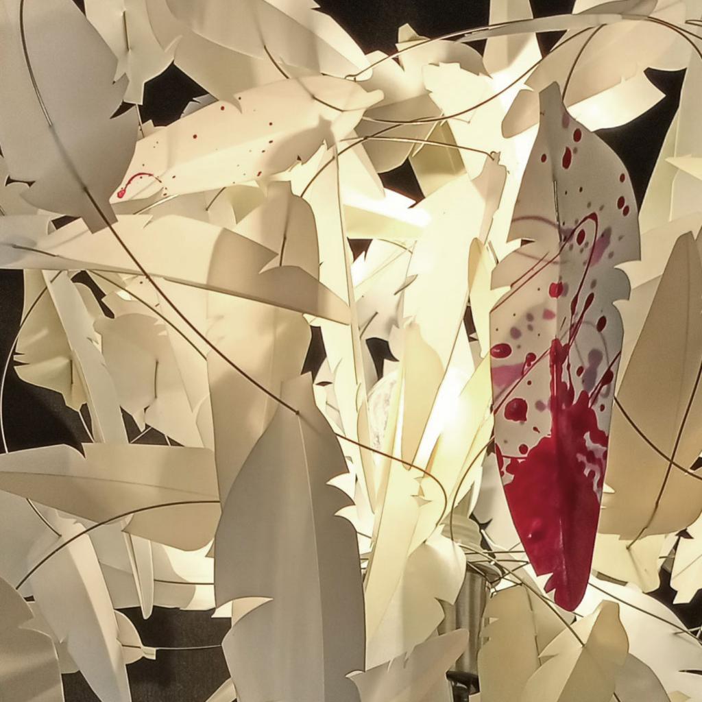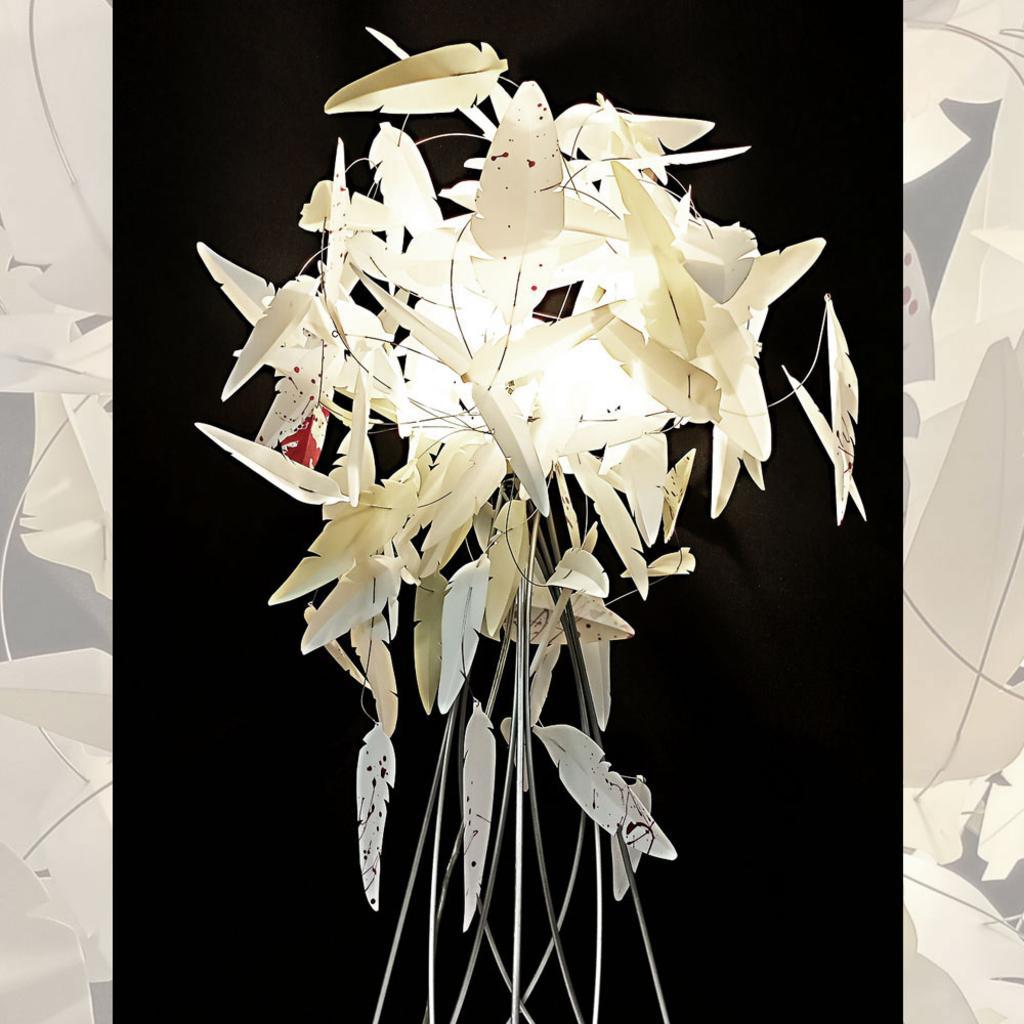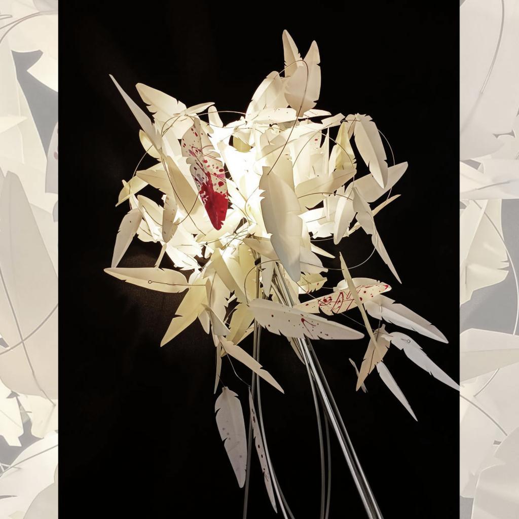 Ein außergewöhnliches Lichtobjekt aus translucenten, cremeweißen und opalweißen Federn, ergänzt durch einige mit rotem Japanlack handbemalte Federchen - drapiert um eine sanfte weiße Lichtquelle.