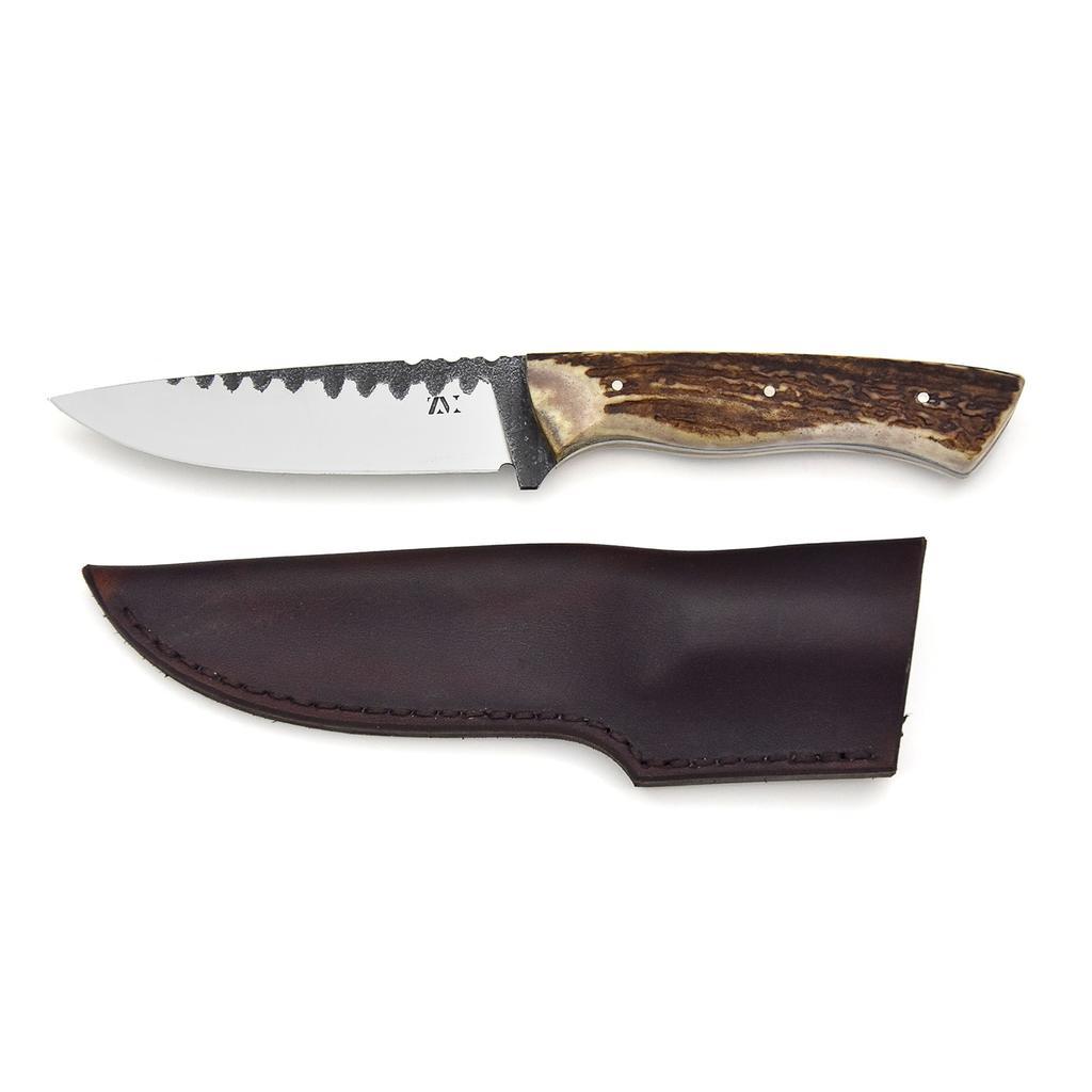 Die charakteristische, rustikale Schmiedeoberfläche mit den sichtbaren Hammerschlägen ist ebenso ein Beweis für die Einzigartigkeit des Messers, wie die Griffschalen aus echtem, heimischen Hirschhorn.