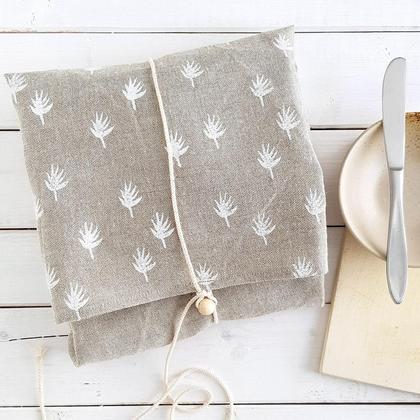 2. Das frisch gebackene Brot kann nun in das ausgeschüttelte Tuch eingewickelt und darin aufbewahrt werden. Dank seiner konservierenden Eigenschaften ist Leinen die beste und bewährteste Aufbewahrunsmöglichkeit für Brot und Gebäck! Das Gewebe ist von Natur aus atmungsaktiv, luftregulierend und bakterienhemmend. Sein robustes Gewebe ist reißfest, antistatisch und schmutzabweisend. Es neutralisiert sogar Gerüche! Brot bleibt daher lange frisch, es fängt weder an zu schwitzen noch zu schimmeln. Mit dem Band aus Baumwolle kann man das Tuch ein- zweimal umwickeln. Dieses nachhaltige Naturprodukt bleibt ein langlebiger, treuer Begleiter!