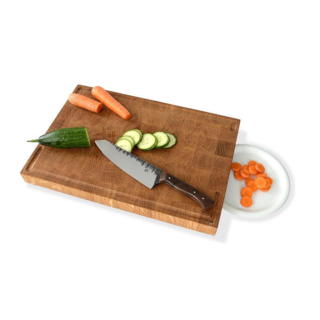 Durch die stirnseitige Verarbeitung des Eichenholzes ist das Schneidbrett äußerst klingenschonend, da die Schneide beim Kontakt mit dem Brett keine liegenden Holzfasern durchtrennt, sondern nur die stehende Faser minimal „spaltet“.