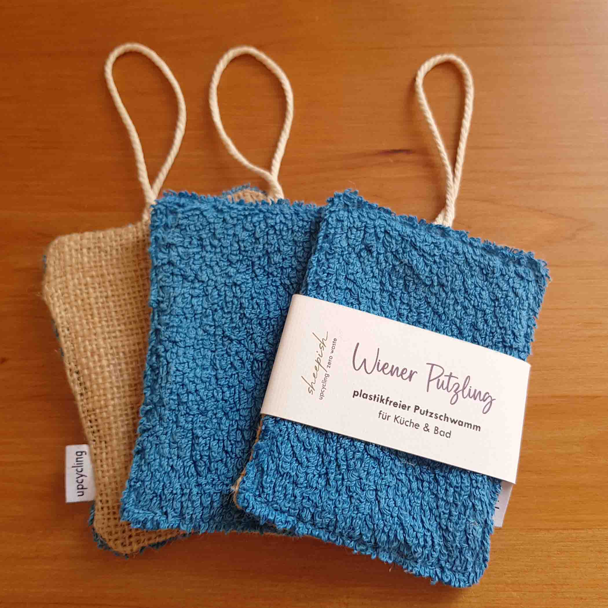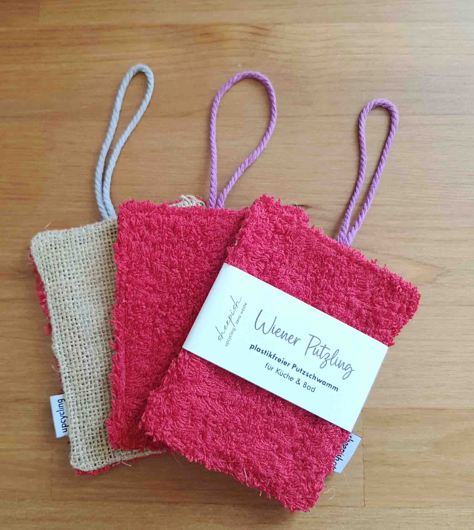 Die Wiener Putzlinge sind plastikfreie Putzschwämme aus Jute, Baumwolle und Frottee. Sie reinigen kraftvoll, die Juteseite hat einen stärkeren Schrubbeffekt, die Frotteeseite ist etwas sanfter und saugfähiger. Zwischendurch zum Trocknen mit der Schlaufe aufhängen z.B. am Wasserhahn und regelmäßig waschen. Die Wiener Putzlinge sind aus Naturmaterialien und geben daher beim Waschen kein Mikroplastik ab.