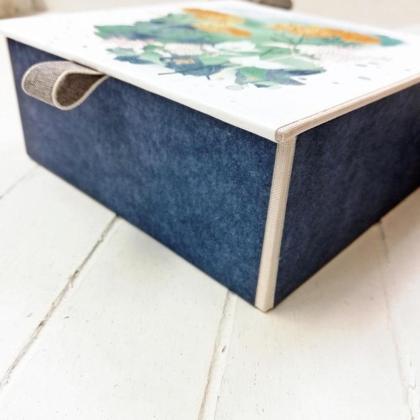 Schöne selbst gebundene Box mit Klappdeckel. Ideal um Erinnerungen aufzubewahren, persönliches stilvoll zu verschenken oder wie hier mit Cocktailservietten zu bestücken.