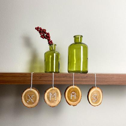 Das Set besteht aus 4 Holzscheiben, die mit den Buchstaben "XMAS" im Kreuzstich bestickt sind.
