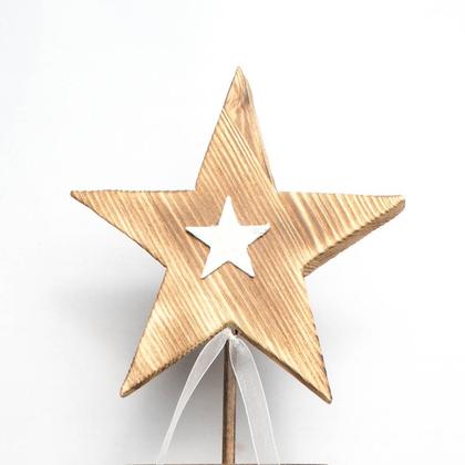 Die Säule ist am oberen Ende durch einen handgemachten, geflämmten Holzstern verziert. Dieser wird in der Mitte noch durch einen zusätzlichen weißen Rindenstern dekoriert.