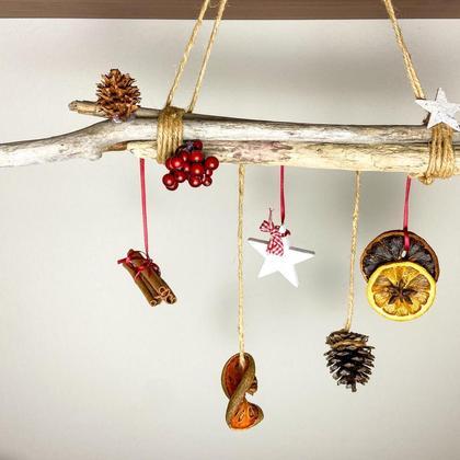 Er ist unter anderem mit Zimtstangen, Zapfen, Orangenscheiben und Sternen geschmückt.