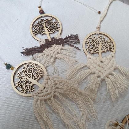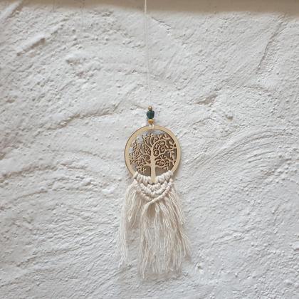 Lebensbaum aus Holz (5cm Durchmesser), von Hand umknüpft mit 100%iger Baumwolle, mit Holzperlen & vergoldeten Metallperlen bestückt.
