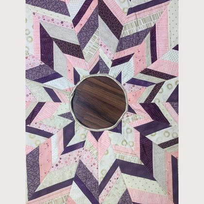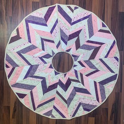Dieser Weihnachtsbaum-Teppich (oder christmastree-skirt, wie er auf englisch genannt wird) ist wie ein Quilt gearbeitet und besteht an der Vorderseite aus 20 Segmenten – die aus Streifen zusammengenäht sind -, einer Flieseinlage und einem einfärbigen Rückenstoff. Der Weihnachtsbaum-Teppich ist zur Abdeckung des Bodens unter dem Christbaum gedacht.