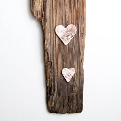 Das Altholzbrett wurde mit vier handgemachten Keramik-Herzen verziert.