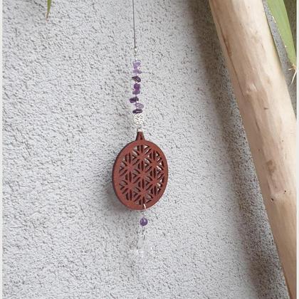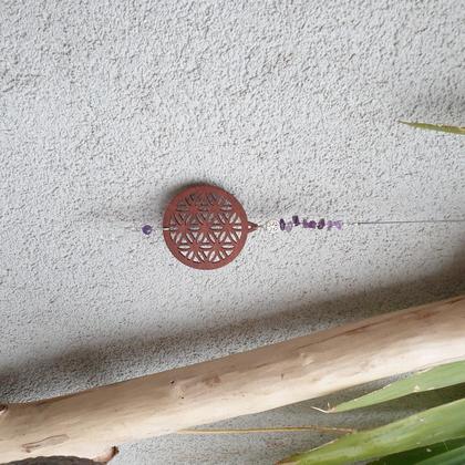 Materialien: Lebensblume aus Holz (55mm Durchmesser), natürlicher Amethyst in unregelmäßiger & einzigartiger Form (somit wird jedes Stück zu einem Unikat)