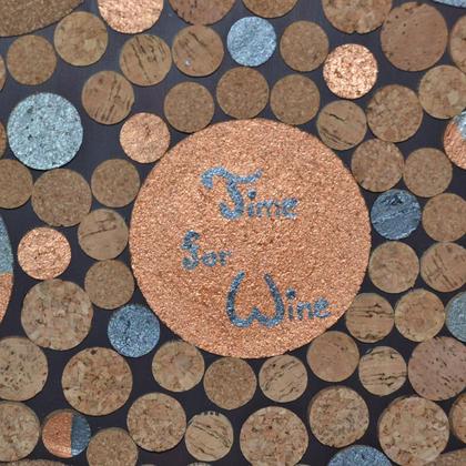 Handgefertigtes Holz Wandbild aus österreichischem Holz verziert mit Korken und Korkelementen und Schriftzug "Time for Wine".