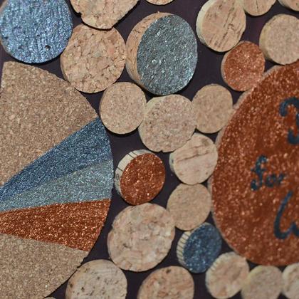 Die Holzplatte ist mit diversen Korkelementen in verschiedenen Größen verziert bzw. mit Acryl Farben bemalt.