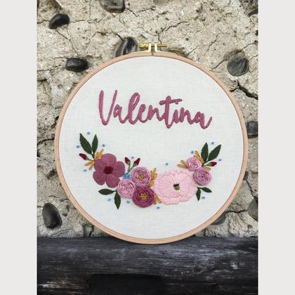 Das Stickbild Lisbeth wird auf naturfarbenem Baumwollstoff gestickt. Der Rahmen hat einen Durchmesser von 22 cm. Der Schriftzug kann natürlich individualisiert werden. Wunschschriftzug einfach bei der Bestellung bekannt geben.