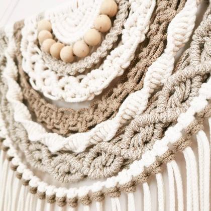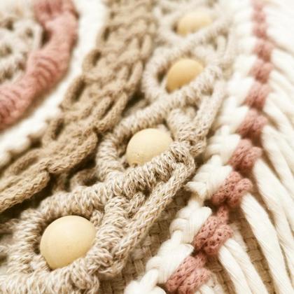 "Jasmin" hat ein schönes Design mit verschiedenen Mustern im Halbkreis angeordnet. Die Holzperlen und die Fransen vervollständigen die Schönheit.