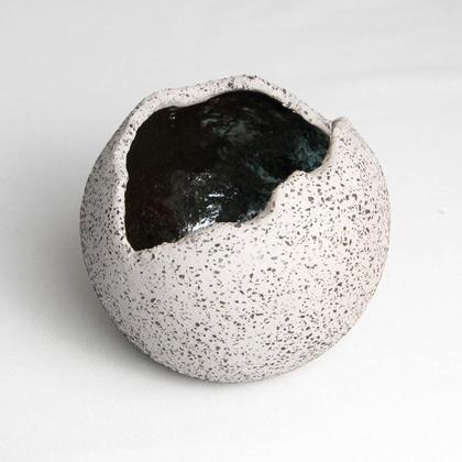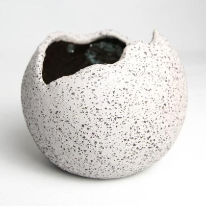 Diese handgemachte Windlicht-Kugel wurde aus Ton in Steinoptik hergestellt.