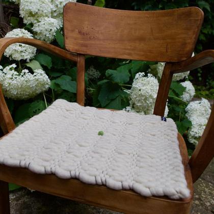 Die Sesselauflage ist handgewebt und aus Schafwolle, ca. 38 x 40 cm, Farbe Quitte. In der Mitte ist eine hangemachte "Erbse" aus Filz; an einer Ecke befindet sich das "Prinz auf der Erbse" - Logo. Die Sesselauflage kann zusammengerollt werden und ist somit auch ein Begleiter für unterwegs.
