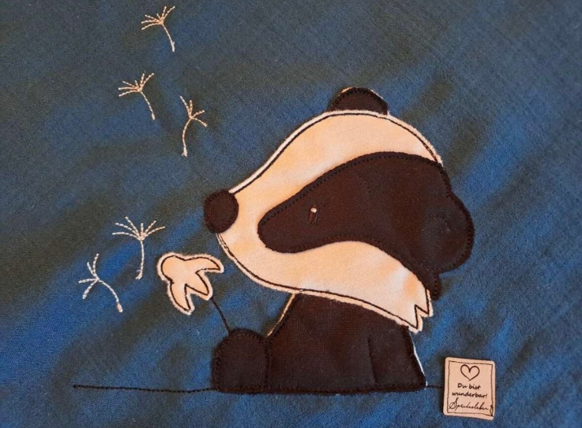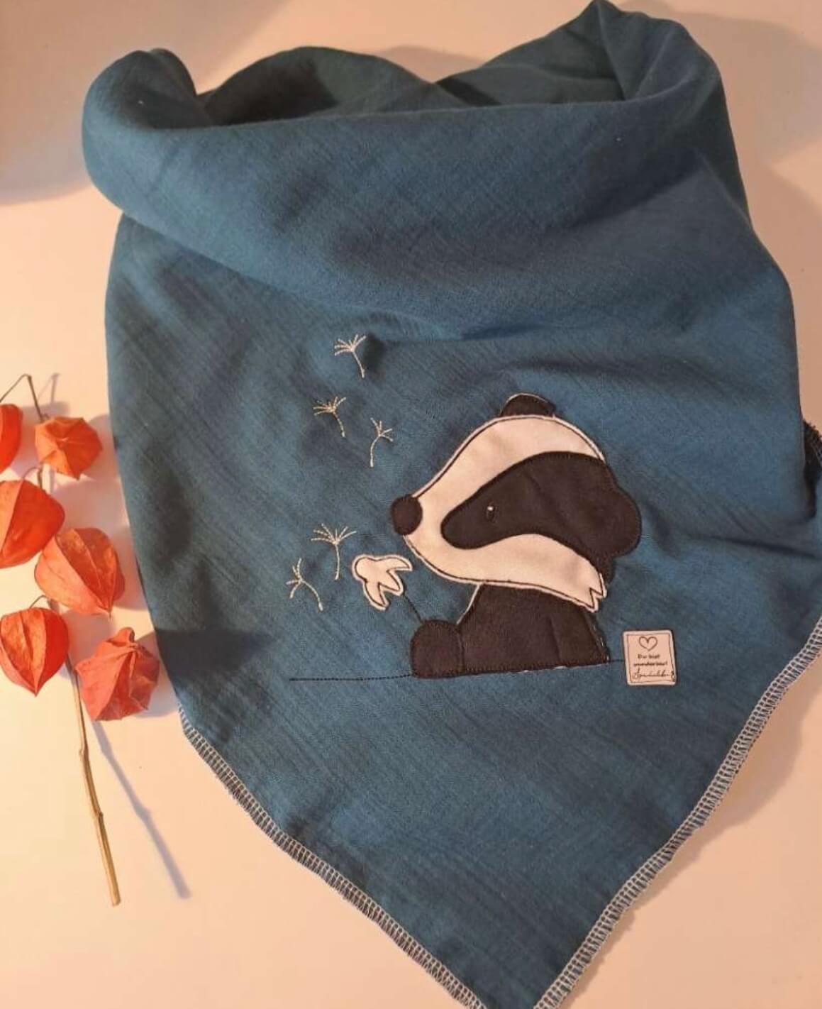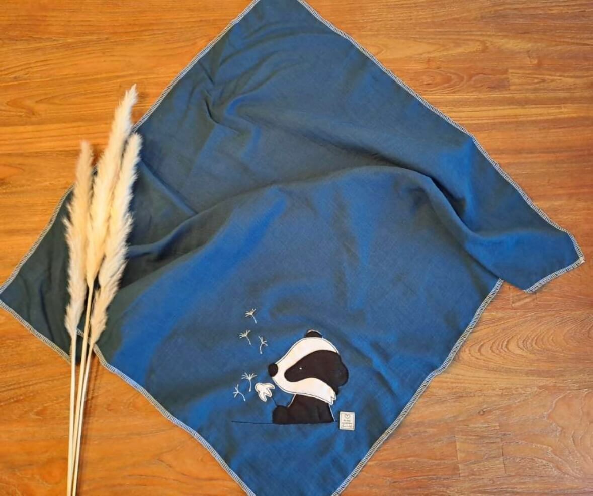 Schönes praktisches Musselintuch. Es kann als Tuch, Spucktuch, als Tuch zum Einwickeln nach dem Baden oder als Unterlage verwendet werden. Extra starke Bio- Qualität; Gots zertifiziert. Größe ca. 63 x 75 cm. Farbe petrol. Ebenso ziert ein süsser Dachs mit einer Pusteblume das hochwertige Musselintuch.
