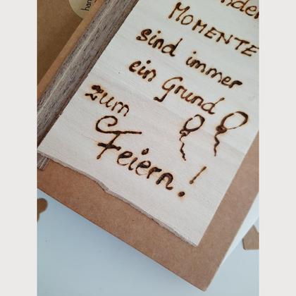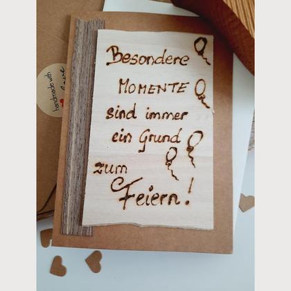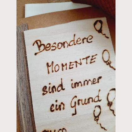 BESONDERE MOMENTE Die Geburtstagskarte ist aus Kraftpapier und 10,5 cm x 14,5 cm groß. BESONDERE MOMENTE SIND IMMER EIN GEUND ZUM FEIERN wurde von mir persönlich per Hand auf Holz gebrannt. Vier Luftballone schmücken die Karte und machen sie zu einem meiner Herzenswerke! Diese Karte ist ein Unikat!