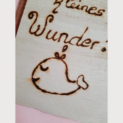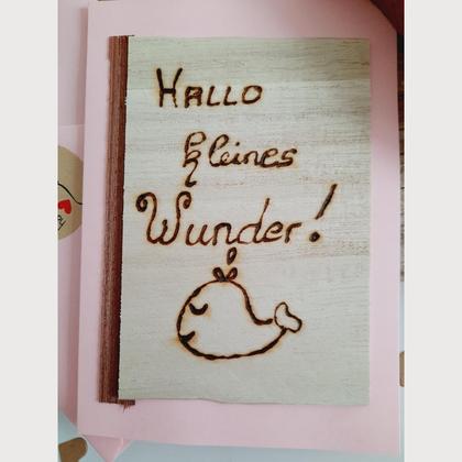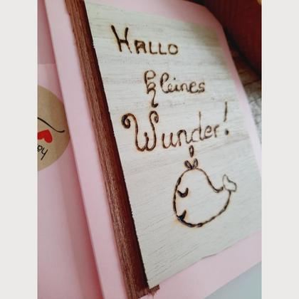 KARTE ZUR GEBURT! Die Karte ist aus rosa Papier und ca. 10,5 x 14,5 cm groß. Hallo kleines Wunder ist für jede Geburt perfekt! Er wurde von mir persönlich mit einem Brennkolben auf Holz geschrieben. Ein süßer Fisch ziert die Karte unter dem Spruch. Ein wunderschönes Holzfurnier ist auf der Seite des Holzes. Ein farblich passendes Kuvert zur Karte ist natürlich mit dabei!