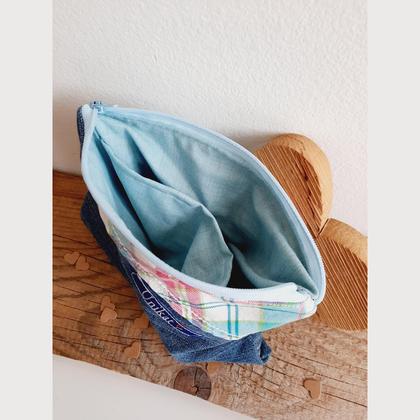 Kosmetiktasche "UNIKAT Blume" ist auch ein Unikat! UPCYCLING Die Kosmetiktasche UNIKAT BLUME ist ca. 20 cm x 16 cm groß! Sie ist aussen aus blauem Jeansstoff der mal eine Hose war und mit Baumwollstoff mit Karomuster verziert. Die Tasche lässt sich mit einem hellblauen Zipp gut öffnen und schließen. Innen ist sie mit dem hellblauem Baumwollstoff gefüttert und hat noch ein kleines Täschchen innen. So ein Täschchen darf in keiner Tasche fehlen und eignet sich perfekt als Geschenk bzw. gleich als Geschenkverpackung!