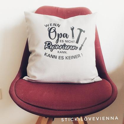 --Kissen Opa-- Mit dieser wunderbaren Kissenhülle wirst Du Deinem Opa bestimmt eine große Freude machen :). Die Kissenhülle wurde fertig zugekauft. Der Aufdruck wurde von mir erstellt. wurde mir schwarzer Flexfolie aufgeplottet. Du bekommst hier nur die Kissenhülle ohne Inlay. Die Kissenhülle ist 40x 40 cm groß und wird mit einem Reißverschluss verschlossen. Sie ist aus 100% Baumwolle.