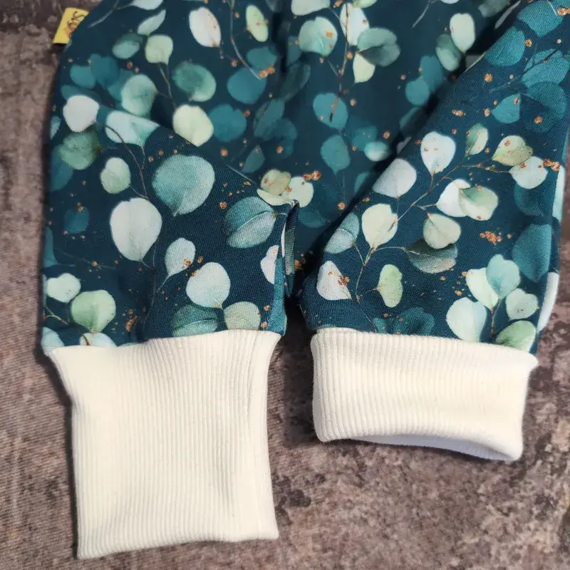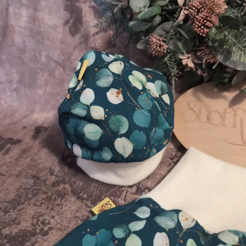 Stell dir vor, dein Baby liegt entspannt auf einer Decke und strampelt fröhlich in seiner Pumphose mit dem sanften Eukalyptusmuster. Auf dem Köpfchen sitzt die farblich passende Haube – alles wirkt harmonisch, natürlich und wunderbar weich. Du siehst nicht nur ein süßes Outfit, sondern spürst, dass dein Kind sich rundum wohlfühlt. Und du weißt: Du hast dich bewusst für ein handgemachtes, nachhaltiges und besonderes Kleidungsstück entschieden.