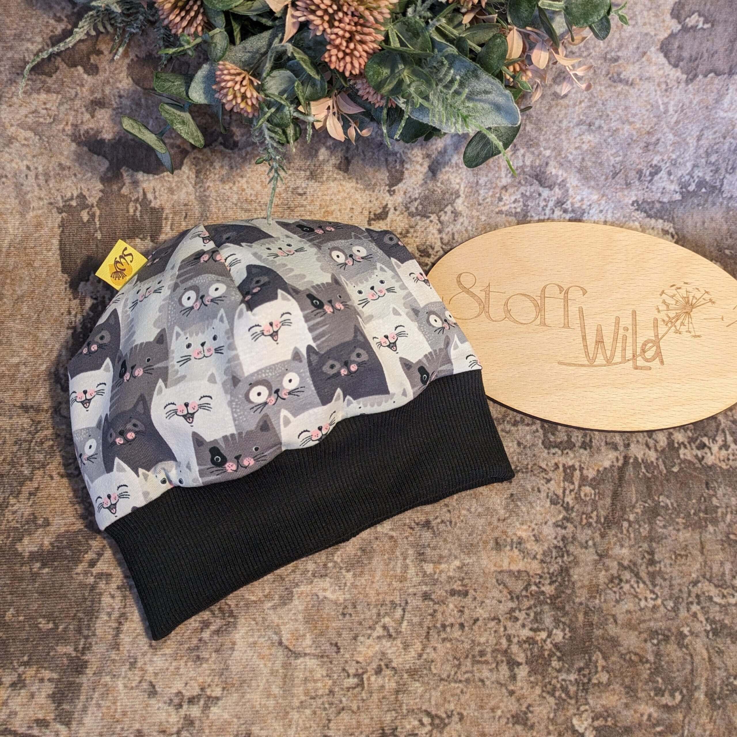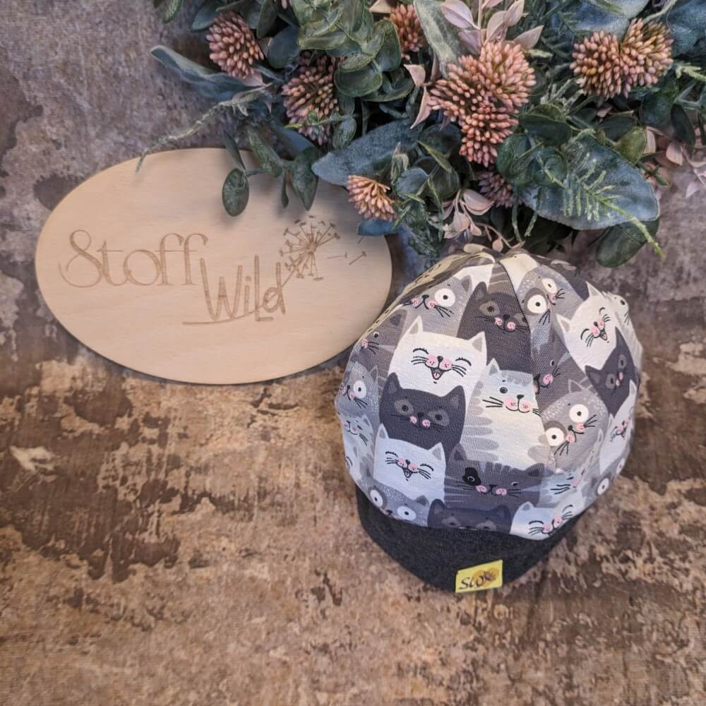 Die Bündchenhaube – Dein stylischer Begleiter für jede Jahreszeit Die Bündchenhaube, auch bekannt als Sommerbeanie, wird aus weichem, einlagigem Jersey-Stoff gefertigt und erhält als Abschluss ein dehnbares Bündchen. Das Allover-Muster mit den entzückenden Katzenmotiven macht diese Mütze zum absoluten Hingucker und lässt Katzenfans-Herzen höher schlagen! Das dehnbare Bündchen sorgt dafür, dass die Mütze perfekt sitzt, nicht verrutscht und sogar über mehrere Größen mitwächst 👍 Ideal für aktive Kids und Erwachsene, die eine bequeme und funktionale Kopfbedeckung suchen 💛 Perfekt für jede Jahreszeit: Im Sommer bietet die Haube optimalen Schutz vor Sonne und Wind. Im Herbst ist sie ein praktischer Begleiter, der an windigen Tagen Wärme und Komfort spendet. Selbst im Winter ist sie eine tolle Alternative zu anderen Mützen, die oft lästig hochrutschen. Das ideale Geschenk: Diese handgemachte Mütze ist das perfekte, nützliche Geschenk zur Geburt, zum Geburtstag oder zu Weihnachten. Sie ist nicht nur funktional, sondern durch das liebevoll gestaltete Design auch ein echtes Unikat. Auf der Suche nach einem Set? Gerne nähe ich euch auch Beanie-Sets für Geschwister, die ganze Familie oder für die besten Freunde! So können alle im Partnerlook strahlen und die Freude an den schönen Katzenmotiven teilen. Sichere dir dieses handgemachte Lieblingsstück und bringe ein bisschen Extra-Stil und Komfort in den Alltag!   Kopfumfang: S (Baby/Kleinkind): ca 36-40/41cm M (Kleinkind/Kind): ca. 41-50cm Bündchenfarbe: schwarz oder dunkelgrau | Gerne nähe ich das Bündchen auch in einer anderen Farbe :)